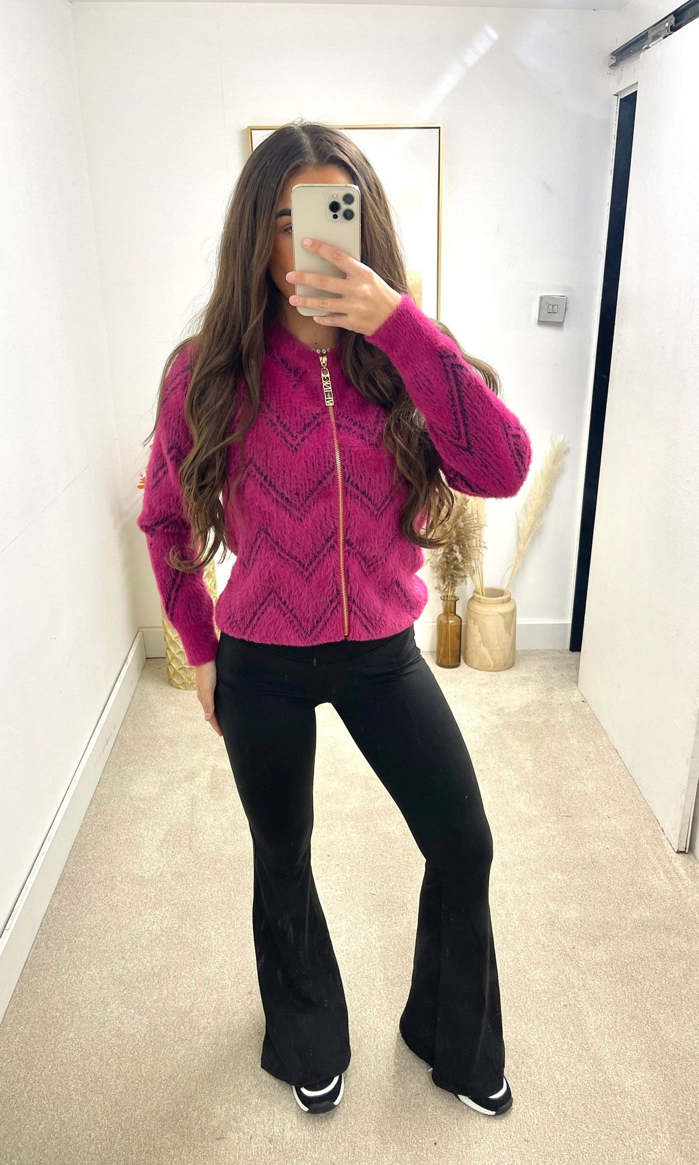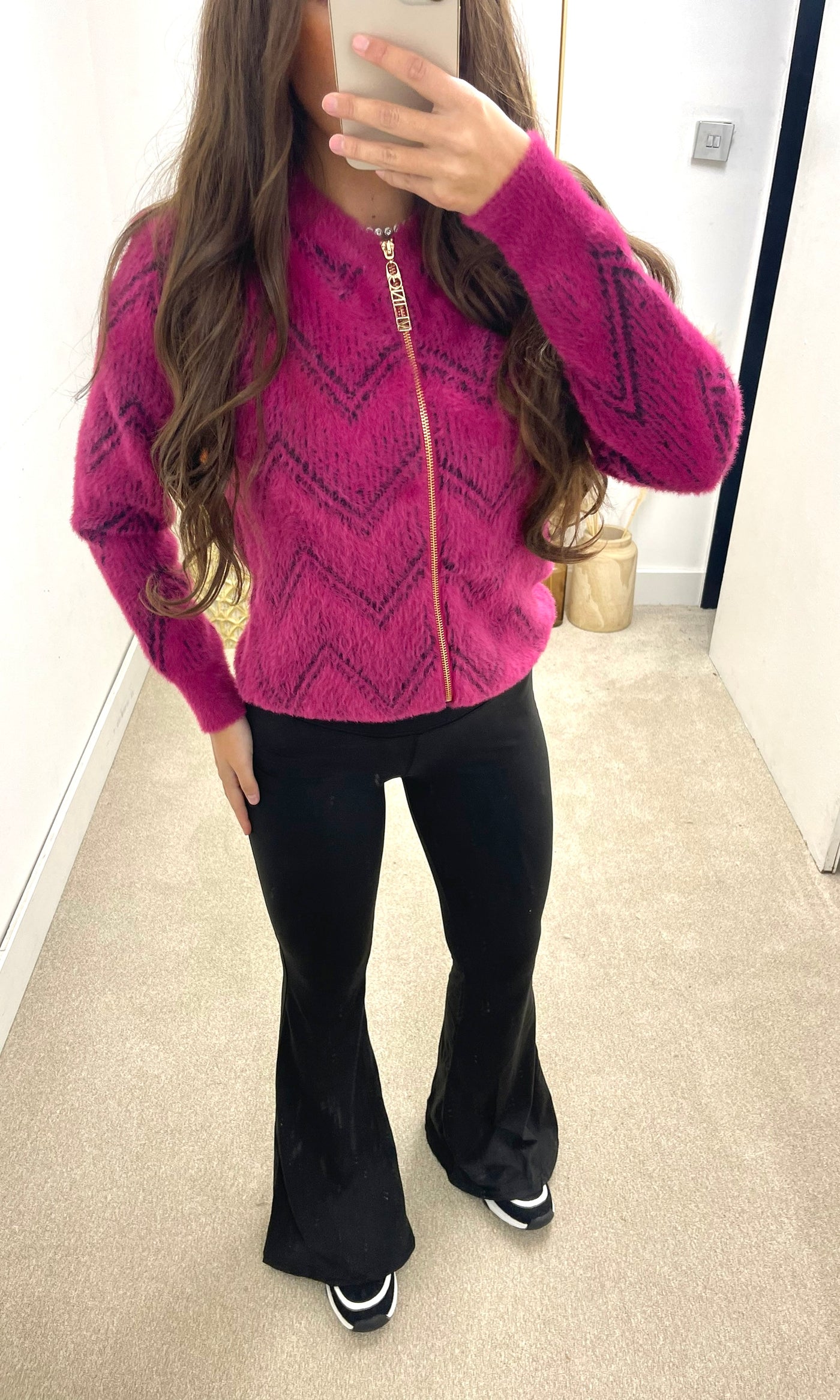 LAURA | Zip Fur Zig Zag Print Cardigan - Hot Pink - ONE SIZE (6-14)