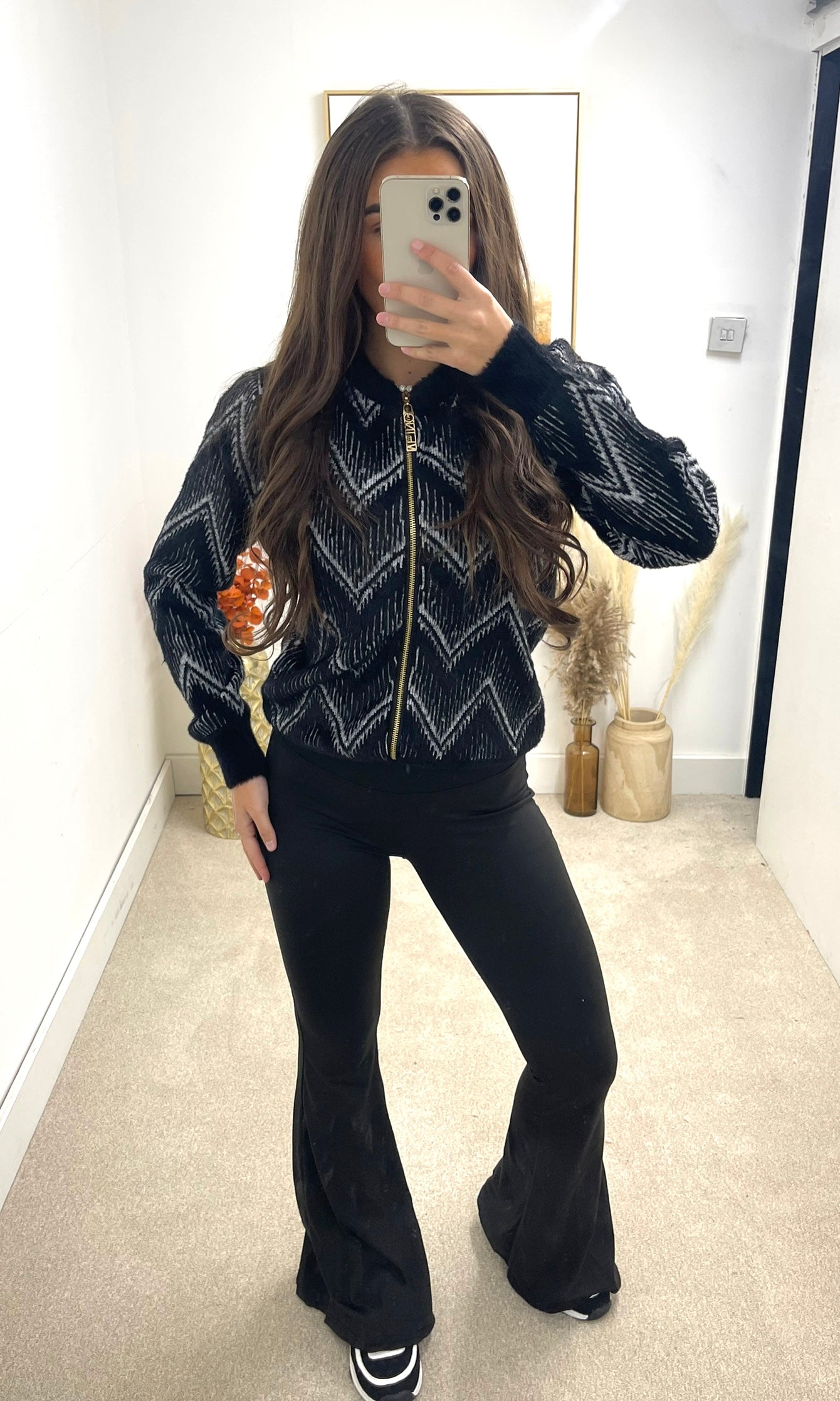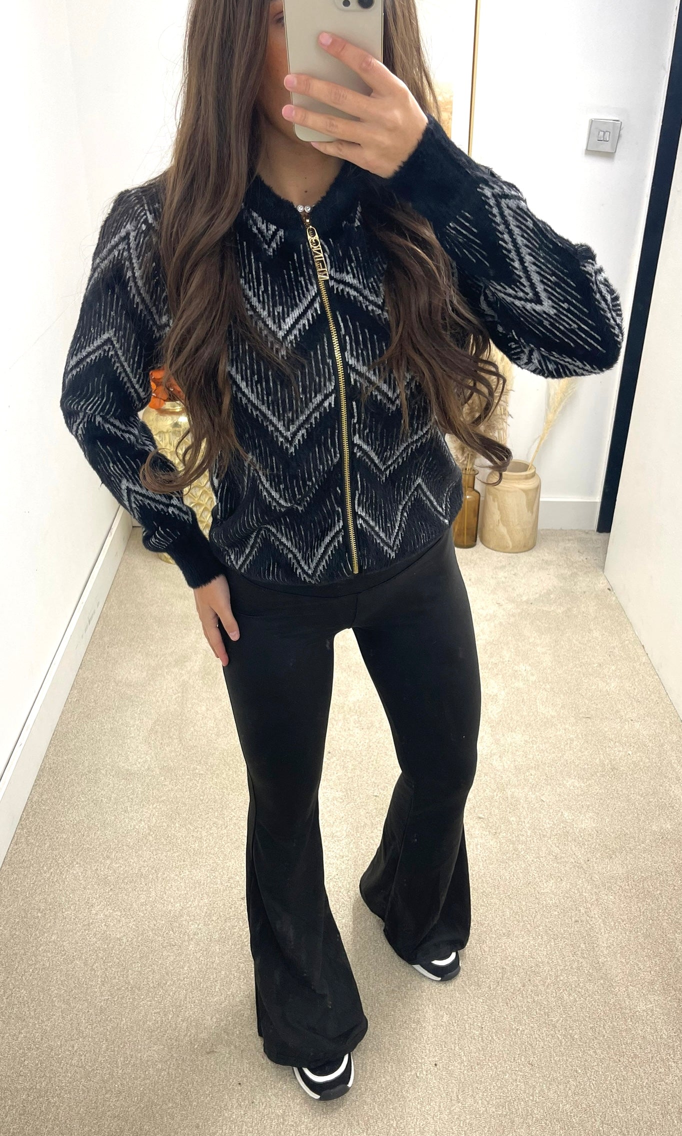 LAURA | Zip Fur Zig Zag Print Cardigan - Black - ONE SIZE (6-14)