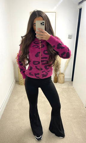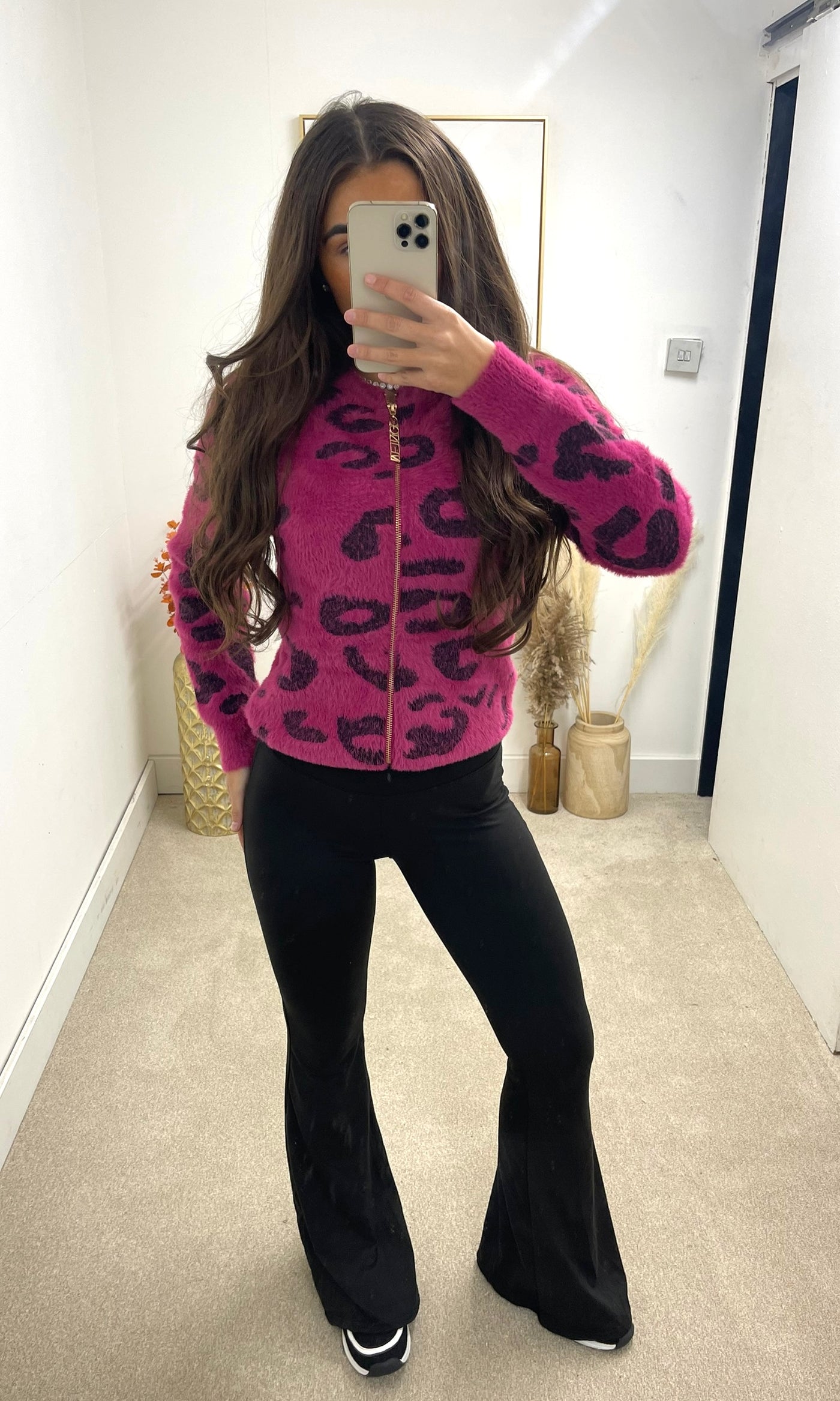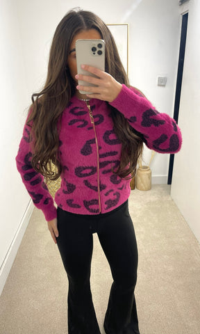 Leopard | Zip Fur Leopard Print Cardigan - Hot Pink - ONE SIZE (6-14)