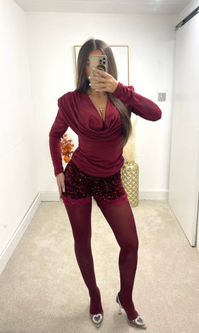ESTELLE | Cowl Neck Padded Shoulder Top - Wine - ONE SIZE (6-14)